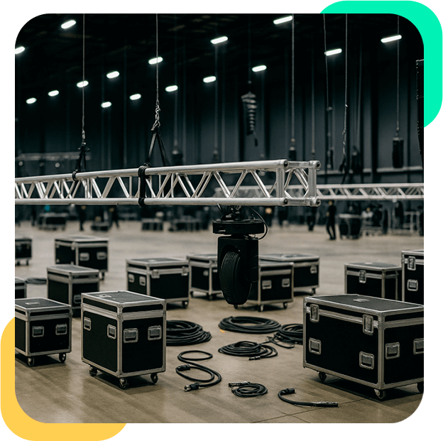 Contamos con los equipos para la instalación física de escenarios, mobiliario, iluminación y sonido para crear un espacio funcional y estético
